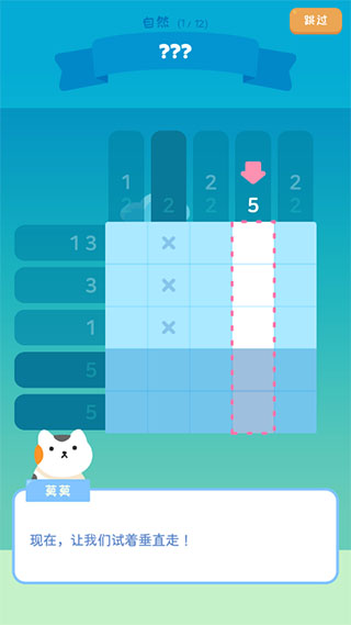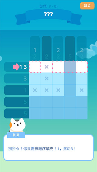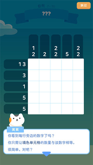 2、新手初级关卡是5x5的表格,每一行、列都有对应数字,只需让填色单元格的数量与该数字一致即可