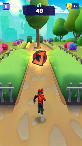 2、向不同方向滑动屏幕可以控制角色的方向,向下进行滑铲通过狭小通道,向上可以进行跳跃,在奔跑的过程中需要进行躲避,并尽可能的手机更多的金币。