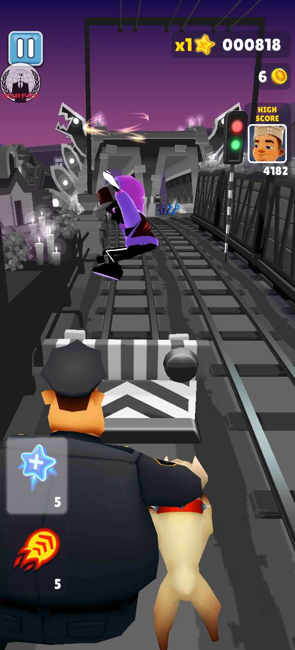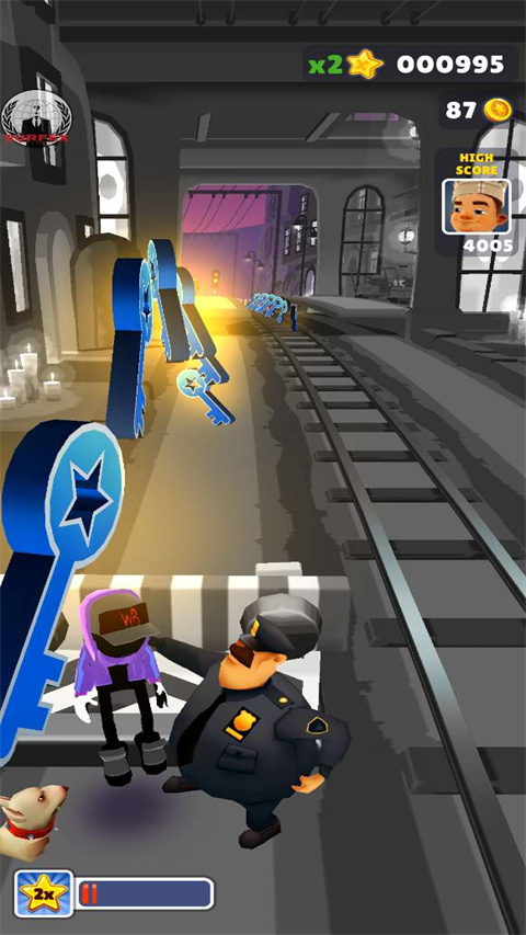 玩家在地铁跑酷小雾神专属版本内化身我们的主角杰克,在三条铁轨中穿梭,迎面将会驰来列车和出现各种障碍物,需要靠玩家快速的反应力,在躲避警察和猎犬的追捕的同时收集钥匙,以获取更高的分数,要注意被警察和猎犬赶上就Game Over咯。游戏内的有多种道具帮助你跑得更远、收集更多钥匙,例如飞行背包、弹力棒、滑板等趣味性道具。感兴趣的小伙伴快来本站下载游玩,开启你的地铁跑酷逃亡之旅吧!
