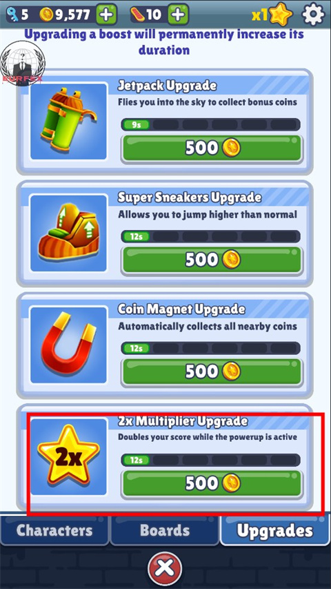 增加角色的弹跳能力,可以跳跃更高更远,在空中停滞的时间更长,不过落地时间很难掌握,使用该道具可以跳上火车,同时也可以在洞口处跳到墙上自杀。不过劝诫新手朋友不要过多使用,一时恍惚做出了错误判断就可能导致游戏结束,然而对于高玩们来说,这却是一款不折不扣的神器,凭借超级运动鞋可省去细微的费神操作,效率提升也十分明显。
