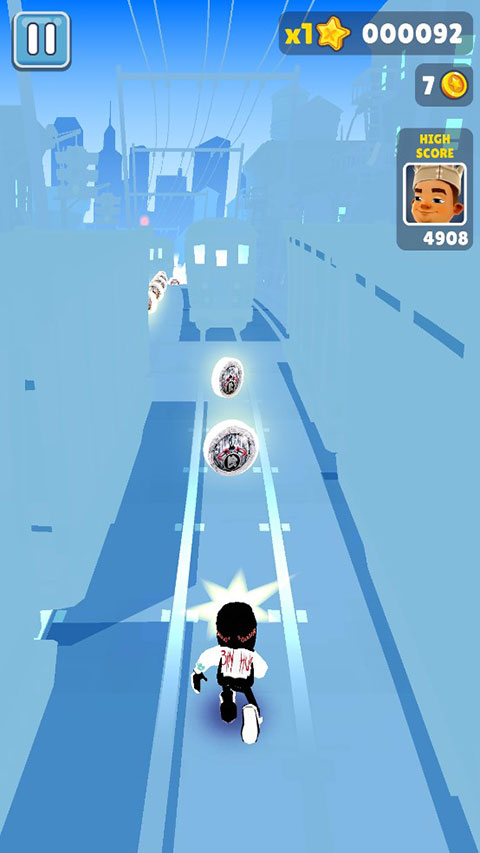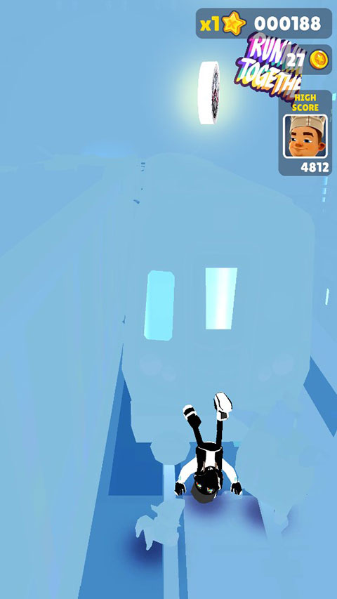 1、先从本站下载好地铁跑酷冰火公益版,下载完成后,打开游戏,你会发现地图全部变成了蓝色,保安也化身为蓝色超人,一定程度上,增加了游戏难度。