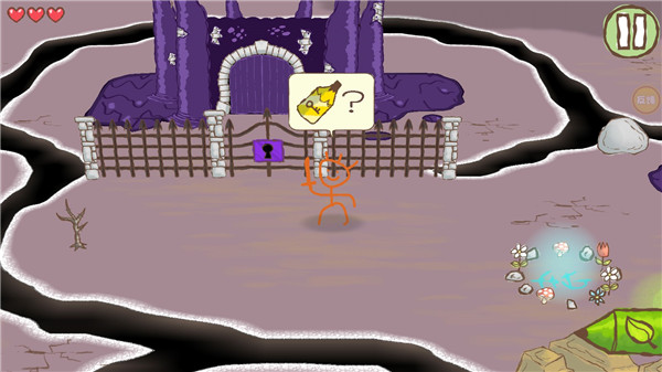 玩家进入到画个火柴人2游戏之后,我们可以看到自己身处在一个符文、石头和小花组成的阵法中,这个阵法是玩家复活的位置,一般到达一定的进度都都会出现类似的重生点。在这个蓝紫色的熔浆位置的时候,会对火柴人造成各种伤害,小伙伴们不能靠近。