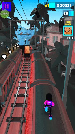 2、玩家可以控制角色在列车上跳跃,可以跟着金币的指引完成列车之间的接力。