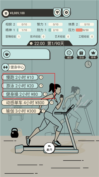 3、去工作中心用职业培训搞造型培训和营销培训提升相貌和精神,其他时间做游戏主播,查阅资料,游泳。有一定资金后换公寓,买保险,去健身房训练动感单车和健身操(大概率刷出大妈和美女事件,爽的离谱,属性加的飞起)把体质刷到7,第三阶段结束。