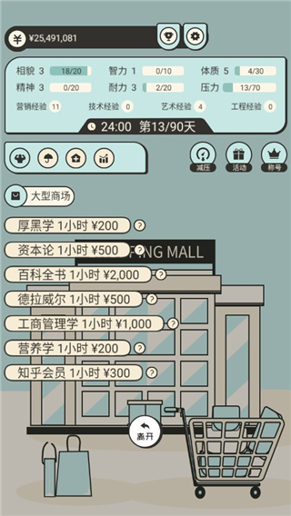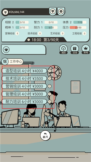 2、游戏的关键在于合理安排时间,提高所需要的属性值,获得更高收入。