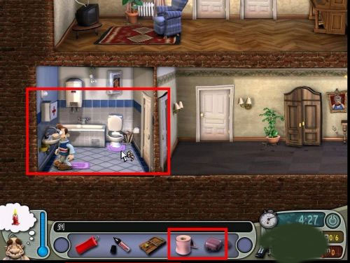 2、接着拿上东西就迅速跑到左侧的卫生间里边,然后在卫生间里得到肥皂,将肥皂放在地上,然后拿到厕纸,放到马桶里边。