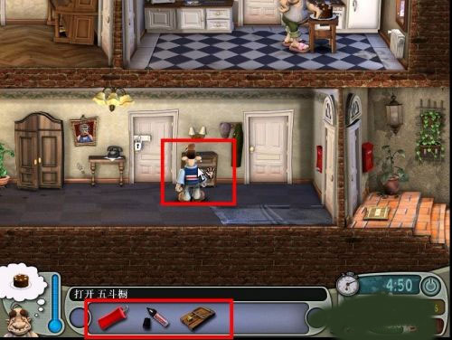 1、进入整蛊邻居1游戏,小男孩进入房门之后,同样还是在柜子的抽屉里找东西,这里会得到鞭炮,黑色笔和捕鼠器。
