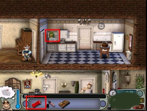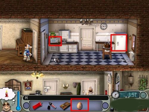 3、接下来从客厅的门进入到二层厨房,当然是boss已经下楼了,迅速到冰箱里拿鸡蛋,然后躲到左侧客厅的门里,时间刚刚好,boss上楼来,等着,等boss下楼然后迅速将鸡蛋放在微波炉里,再次躲到门后边。