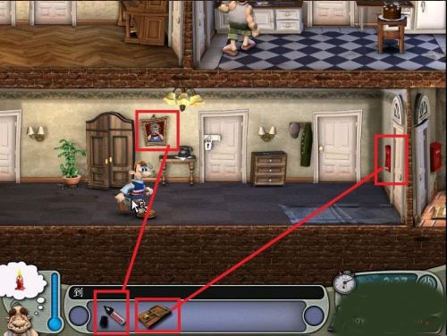 6、接下来就是看boss表演的时刻了,先是鞭炮爆炸,接着boss打开信箱会被捕鼠器夹到手,接着往厕所跑的时候看到画像被涂黑,接着跑到厕所被肥皂滑倒,然后就是马桶堵了,这可把boss气的不轻。