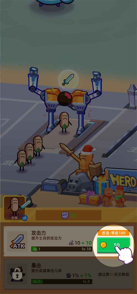 5、最后来到战场,每个游戏关卡都会有一个boss,我们需要使用制造出的英雄打败它们,即可获得奖励,并使用资源快速发展英雄工厂,制造强大的军团;