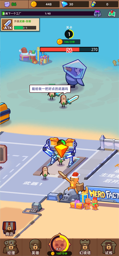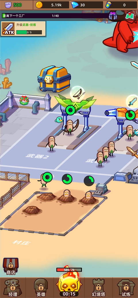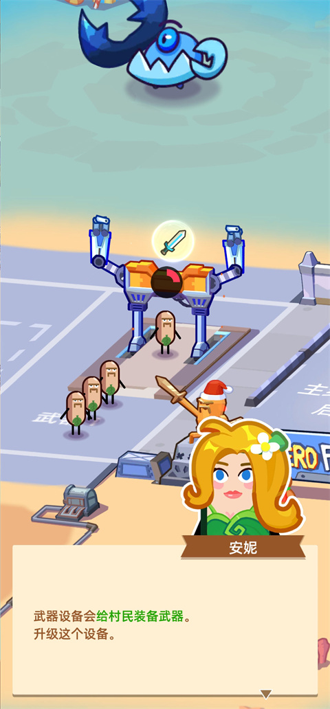 2、在工厂内有会有一个专业的武器设备给村民装备武器,不同的武器设备装备的英雄的职业也有所不同;