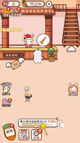 1、在动物旅馆内玩家每天可以通过完成任务来赚取到超多的胡萝卜。2、玩家可以利用胡萝卜去购买更多的旅馆设备,这样才会有着更多的顾客来消费。