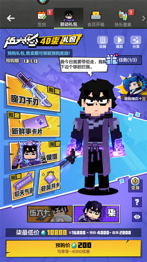 进入我的世界伍六七版本内即可获得丰富的礼包,比如4D伍六七皮肤、伍六七专属头像框、伍六七新鲜事卡片、伍六七聊天气泡、4D柒皮肤、魔刀千刃、柒头像框、柒新鲜事卡片、柒聊天气泡、会员30天等等。当然,伍六七联动版本内还有特定的春节特卖活动,不仅包括众多热门组件,还会采用特殊的满减机制,折扣优惠超乎想象,国风装备和新春伙伴等你带回家,让你和小伙伴一起在方块世界度过别样春节。如果你是我的世界和伍六七的爱好者不妨来下载游戏畅玩一番吧!