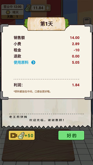 除此之外,煎饼果子游戏也很注重细节,不仅房租、食材、小费、退款等每一天都会有一个结算,让玩家可以清楚看到自己的盈利,而且游戏内每天的利润都不一定是赚钱,因为客人也会退款,当我们放多其他的食材也是会扣费的,非常真实!很推荐大家试试哦!