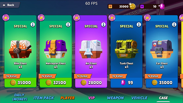 玩家点击左边的Case,即可进行宝箱的购买,可以购买金币宝箱和钻石宝箱,里面有武器、英雄皮肤等奖励。