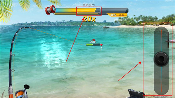 4、鱼儿咬钩后,点击右侧滑动,注意鱼线张力,并且根据鱼线张力值的高低,随时调整你手指的上下滑动!鱼线张力太高或者太低都会让鱼跑掉,让其保持在张力条中间最好