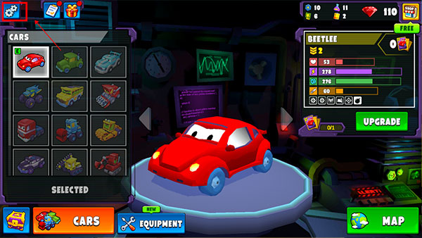 1、在本站下载安装好疯狂车吃车5中文版,打开进入,点击左上角的设置按钮。