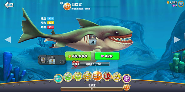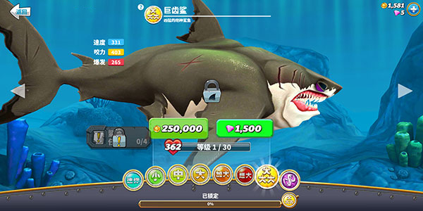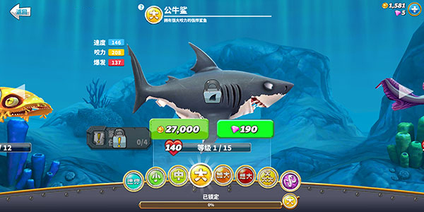 饥饿鲨世界创造了31个种类的鲨鱼,玩家可以升级它们的能力、培养它们的个性。玩家通过完成任务与赚取金币升级鲨鱼,鲨鱼共有7个级别。每次升级鲨鱼后就会解锁技能,如:摧毁墙壁、吃掉更大更强的捕食者、增加更多奖金、获得宠物等帮助鲨鱼更好地进行捕食。而且在游戏中一共提供了三个海域场景供玩家选择,你是喜欢太平洋、北冰洋还是阿拉伯海,当然刚开始玩家只能在太平洋玩耍,随着游戏的进程玩家需要花费道具去解锁其他海域。喜欢冒险和生存的你,千万不要错过!更新日志