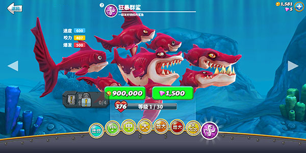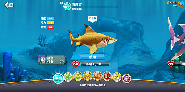 饥饿鲨世界有超过30种鲨鱼种类从7种不同大小的鲨鱼中选择,每个级别、每个环境里都有大量的敌人等着去消灭。1、迷你号(XS)鲨鱼: