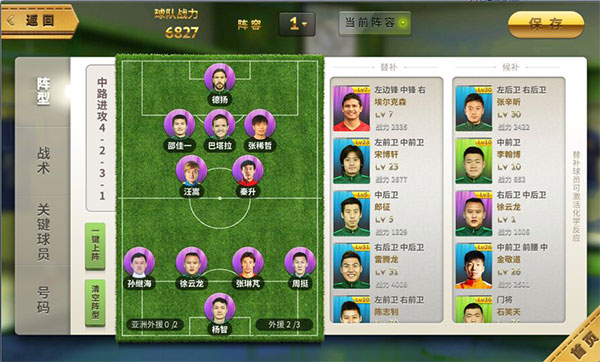 进入阵型界面,玩家可以发现《中超风云》的阵型设置不仅包括普通的阵型以及关键球员设置,还可以发现一个特色系统----球衣号码。