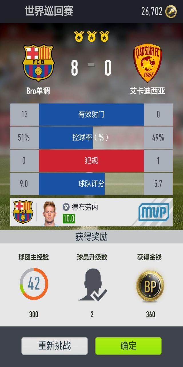 世界巡回赛难度相对较低,在第一场试验,就8球狂胜艾卡迪亚西,获得了经验和金币的奖励。