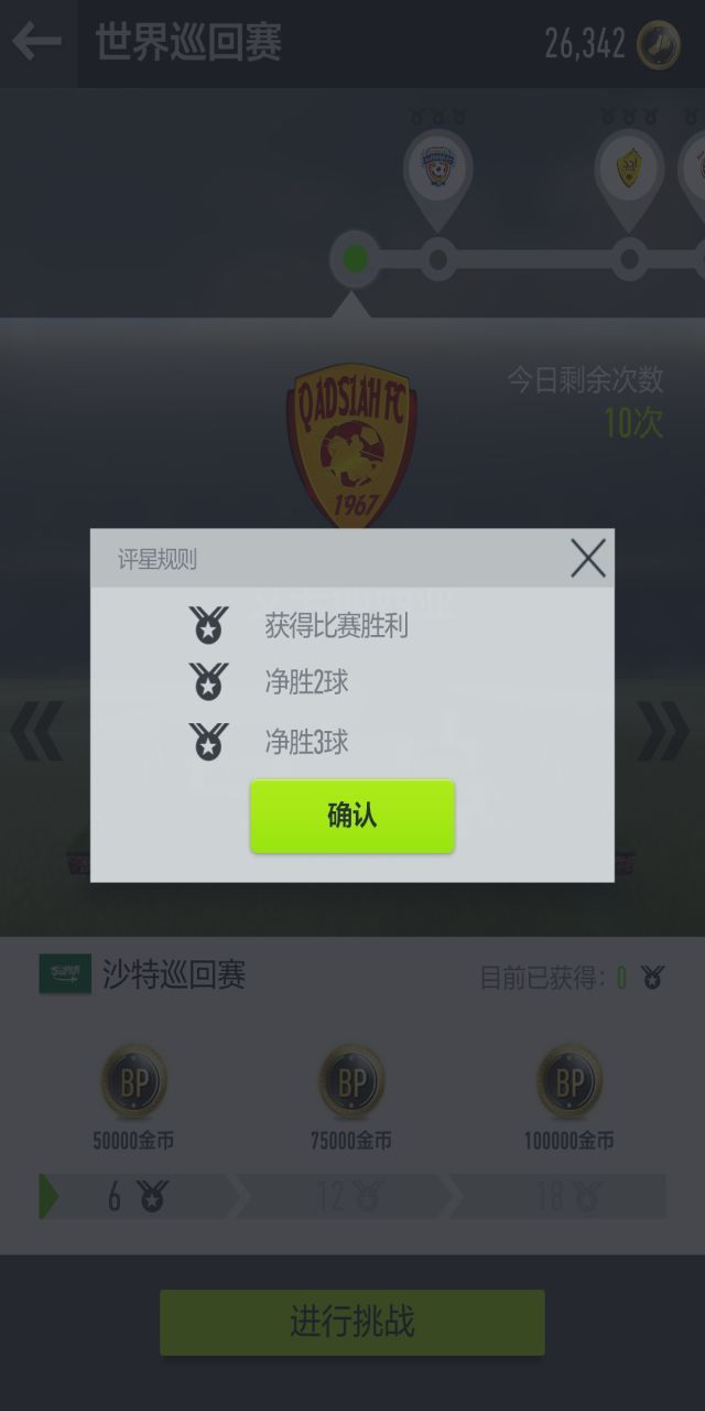 此外,世界巡回赛也有内置任务奖励,完成相应的任务可获相应的星级,例如下图的净胜3球就可以获得1星奖励,地区巡回赛累计星级后可以获得金币奖励,也是玩家前期获得金币的重要途径。