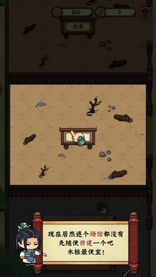 1、先从最基础的做起,先修建一个木桩场馆,点击图中所示的位置,进入武馆修葺,最初先来一个木桩馆