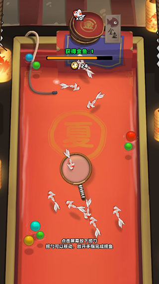 3、点击屏幕放下捞勺,捞勺可移动,放开手指完成捞鱼