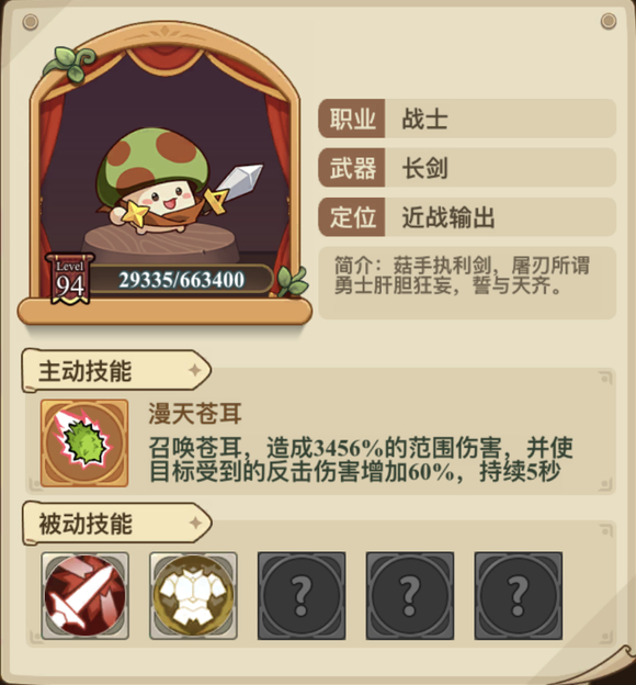 转职为战士后,菇勇者的武器将化为长剑。同时,自身获得了可以范围打击,并使敌方目标受到额外反击伤害的主动技能,以及增加反击几率和增加防御的被动技能。
