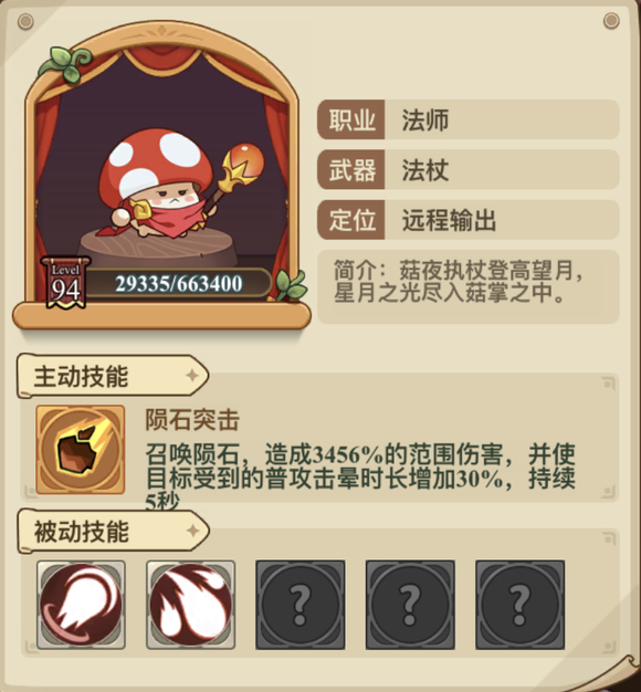 法师手持法杖,和弓箭手一样擅长远距离作战。成为法师后,便拥有了范围攻击和额外增加击晕时长的主动技能,以及增加击晕概率、增加普攻伤害的被动技能。