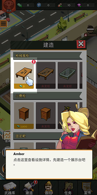 2、建造列表中含有种类繁多的设施,每种设施还有不同等级可以升级,点击这里查看设施详情,先建造一个展示台。
