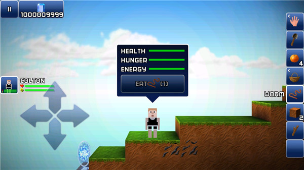 4、一开始我们要去收集基础物资,挖掘地面可以获得泥土,挖掘黑色地面可以获得燧石,采集树叶可以获得树枝,破坏木头根部可以直接摧毁整棵大树,获得树枝和木头以及树上的果实。
