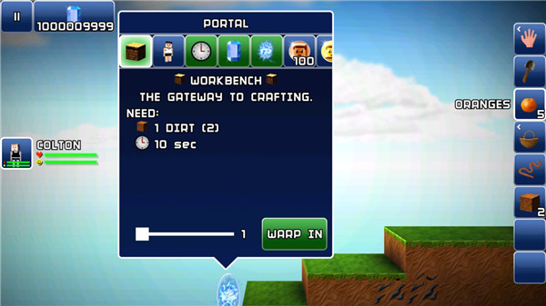 5、四项基本物资都收集一些然后回到出生点制作工作台,点击蓝色漩涡,第一个就是工作台,点击warp in即可消耗一个泥土开始制作工作台。