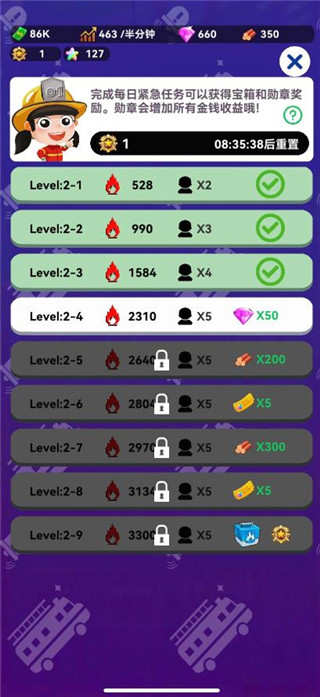 5、最后一关打通才会获得勋章,累积勋章会大幅提升金钱收益,同时勋章会提升第2天的任务难度;