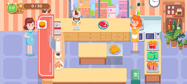1、玩家可以随意的分配时间,烹任各种物品,满足客人需求。2、解锁更多仓库,购买更多优质食品,创造更多美味食品可以更快的过关。