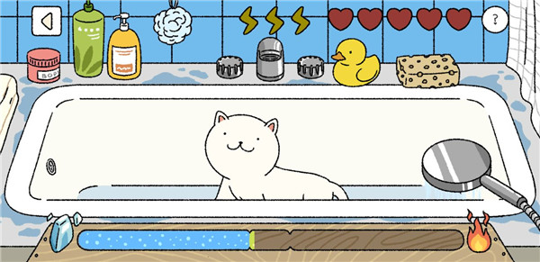 8、洗澡:这个比较麻烦,需要控制手机的左右高度来稳定进度条,位于绿条时水温合适,拖动淋浴头给猫洗澡。需要注意的是,每次成功的洗澡都会增加水温。如果你是模拟器玩家,记得及时把淋浴头拖到右下角去,因为猫走上去也算。之后再调整模拟高度。