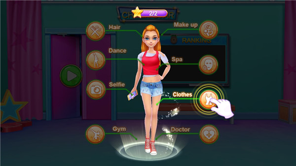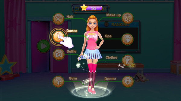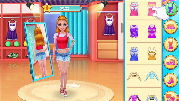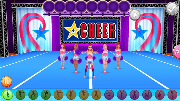 1、游戏画面卡通有趣,打造了很多不同的角色形象,玩家可以自由选择,体验精彩的啦啦队表演2、玩家在游戏中可以对角色的衣服和妆容进行搭配,能够更好的完成表演,获得更多的奖励
