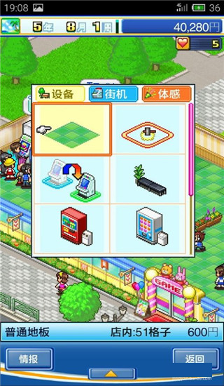 2、进入游戏后根据新手提示放游戏机了,进入设置点【街机】放里面的游戏机,放三个在一起就可以出专区了,能提高魅力值增加客人使用。