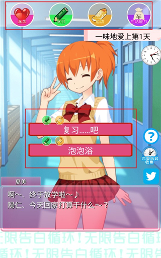 1、无限告白循环游戏中,玩家扮演的男主在一所学校里学习,你会在这里遇见许许多多的美少女。2、与可爱的女孩子们展开日常互动聊天,每一个选项都将影响她对你的看法。