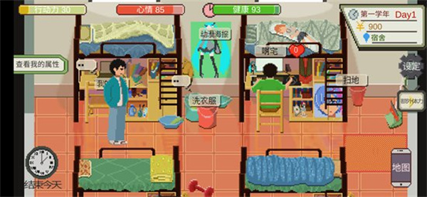 1、进入游戏后,我们最先看到的,是自己在宿舍的桌子,可以看到左侧显示的是自己的属性,另外桌子上有“我的电脑”、“安排学习”、“我的手机”等物品。