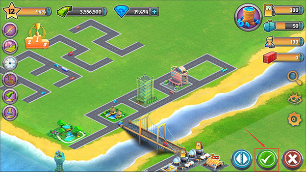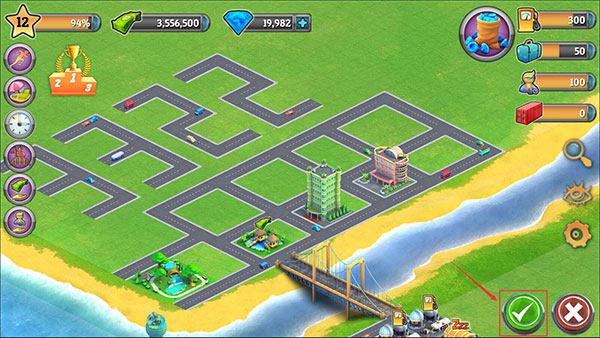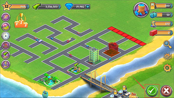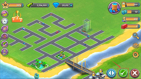 5、然后第二个道路图标是代表着道路建造的意思,点击之后就能进行道路的建造了,先在地图上规划好道路,规划完成之后,同样是点击右下角的绿勾图标。