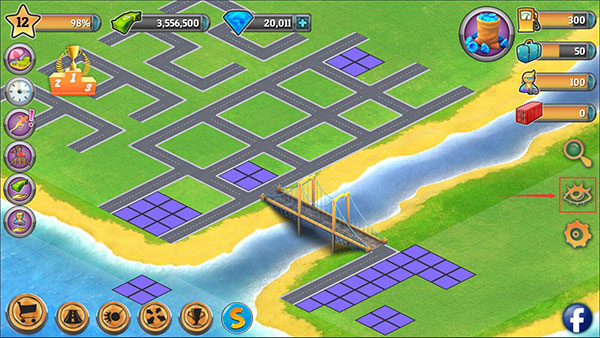 8、右侧的眼睛图标表示切换视角,点击之后,会议建造视角进行查看,紫色地块代表该区域已经存在建筑设置,无法再在此地进行建造了。