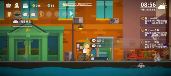 3、共享单车2r每次(上下车算一次,需规划好行程。车上可对话,购物,但限街道上镇民),骑行时加速可消耗精力值获得活力经验(红色)。