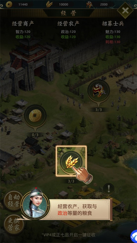 经营产业来获得获得的银两,从而可以升级门客、招募士兵;