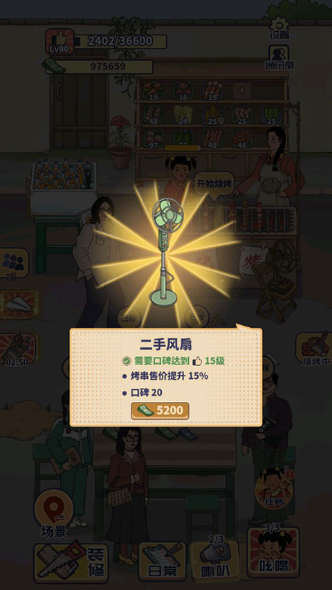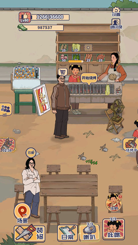 1、全新的烧烤摊经营模拟游戏,开启全新的经营挑战。