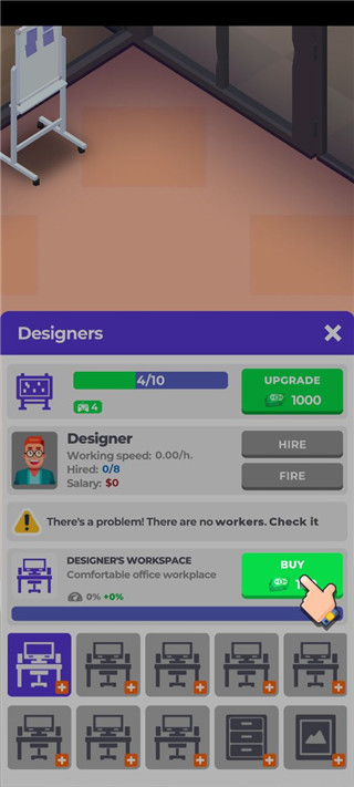 1、刚开始要从最基本的开始进行,布置工位,招募员工。从中不断的获得经验来提升等级。