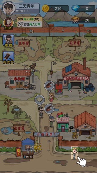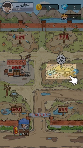村里唯一一个工厂的老板居然带着存款跑路了,乡亲们的工资都没有了着落,游戏主人公大壮作为村里唯一的“高材生”,决定接手工厂发展皮革产业,带着乡亲们发家致富,从来没有过创业经验的大壮,决定带领乡亲父老走向小康。1、起初,玩家需要先把厂房搭建起来,具体的操作方法,如图中光标所示,点击即可修建