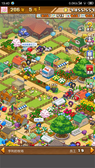 说完赚钱的,再说点员工的。在初期也就是互动商店岀现时,先招八个员工,职业平均就行。钱的话初期给你的钱加上开店所得的钱招八个还是够的,边招边各造一个加移速的装备,在全造好后把三维练到各二十升E级员工,接着各造一个加成热情或工作或体力的装备,以最快速度把三维都提到两百以上拿年底第一。