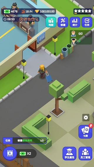 3、记住,建造物品都可以提高我们的收益,但这并不是主要关心的重点,作为校长要时刻注意学生们的状态,查看“学生属性”,学生有4种不同的需求,满足不了就可能会出现饥饿、生病甚至是退学。