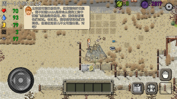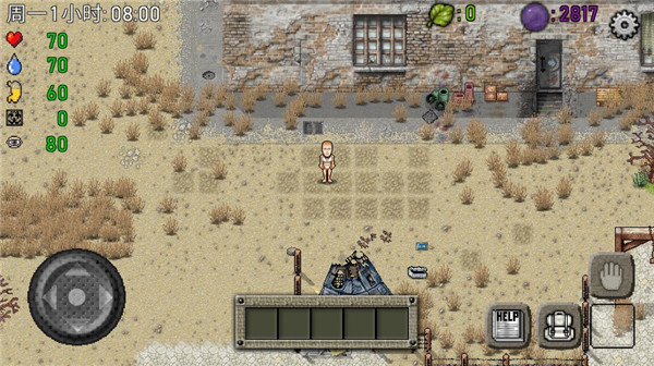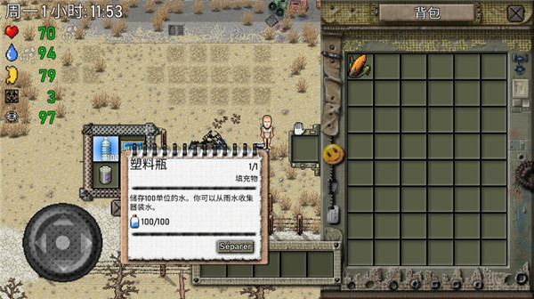 开局会找到饮用水一瓶(洁净的饮用水底色是蓝色,污染的水是黄绿色。)瓶子留着可以装水;